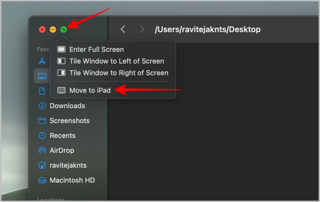 Также вы можете навести курсор на зелёную кнопку в левом верхнем углу любого активного окна и выбрать Переместить на iPad.