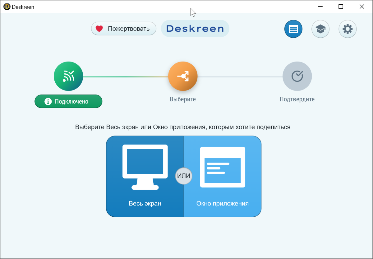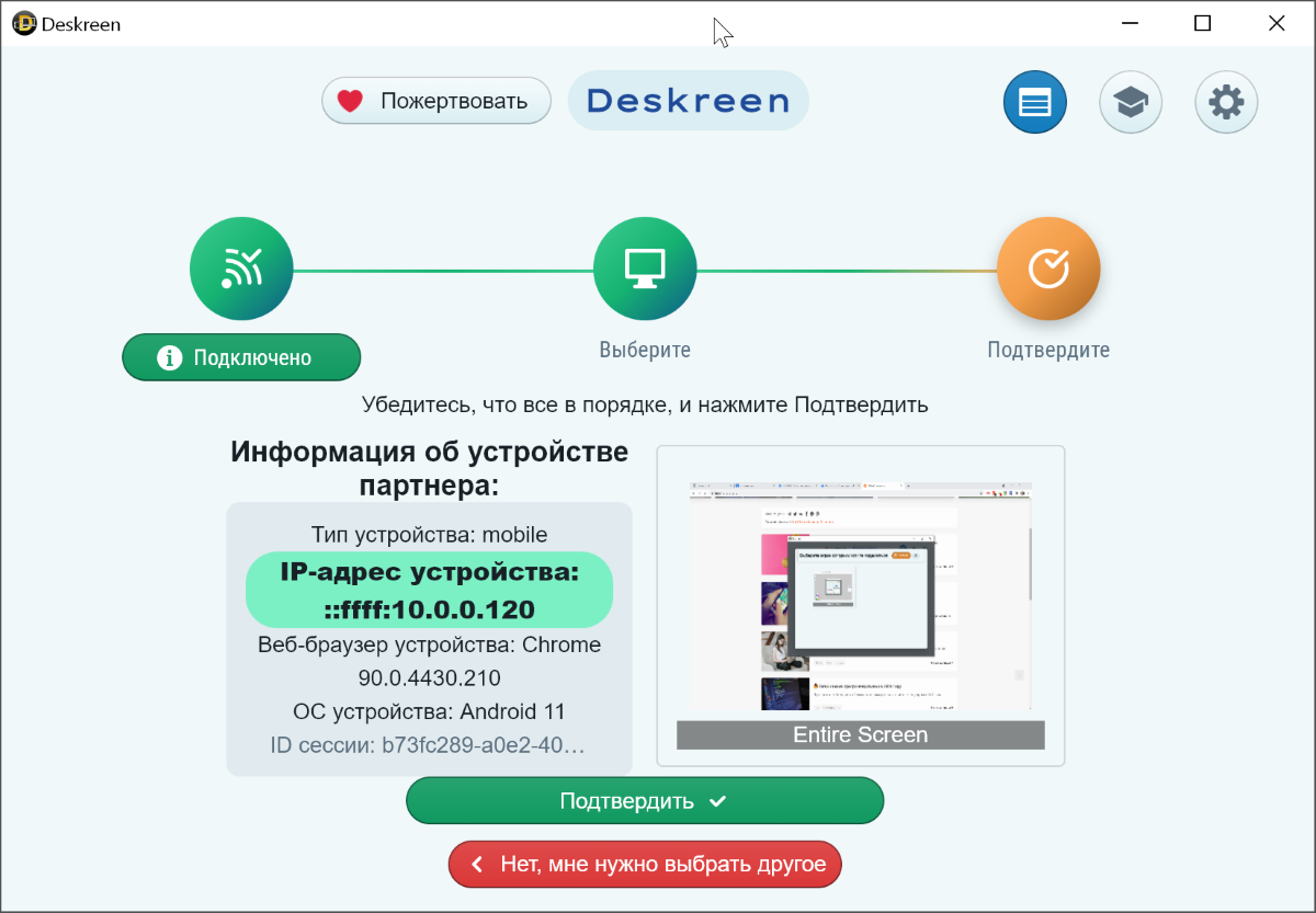 По умолчанию Deskreen передаёт картинку с вашего монитора на просмотр на втором устройстве. Таким образом, можно просто поделиться картинкой с компьютера.