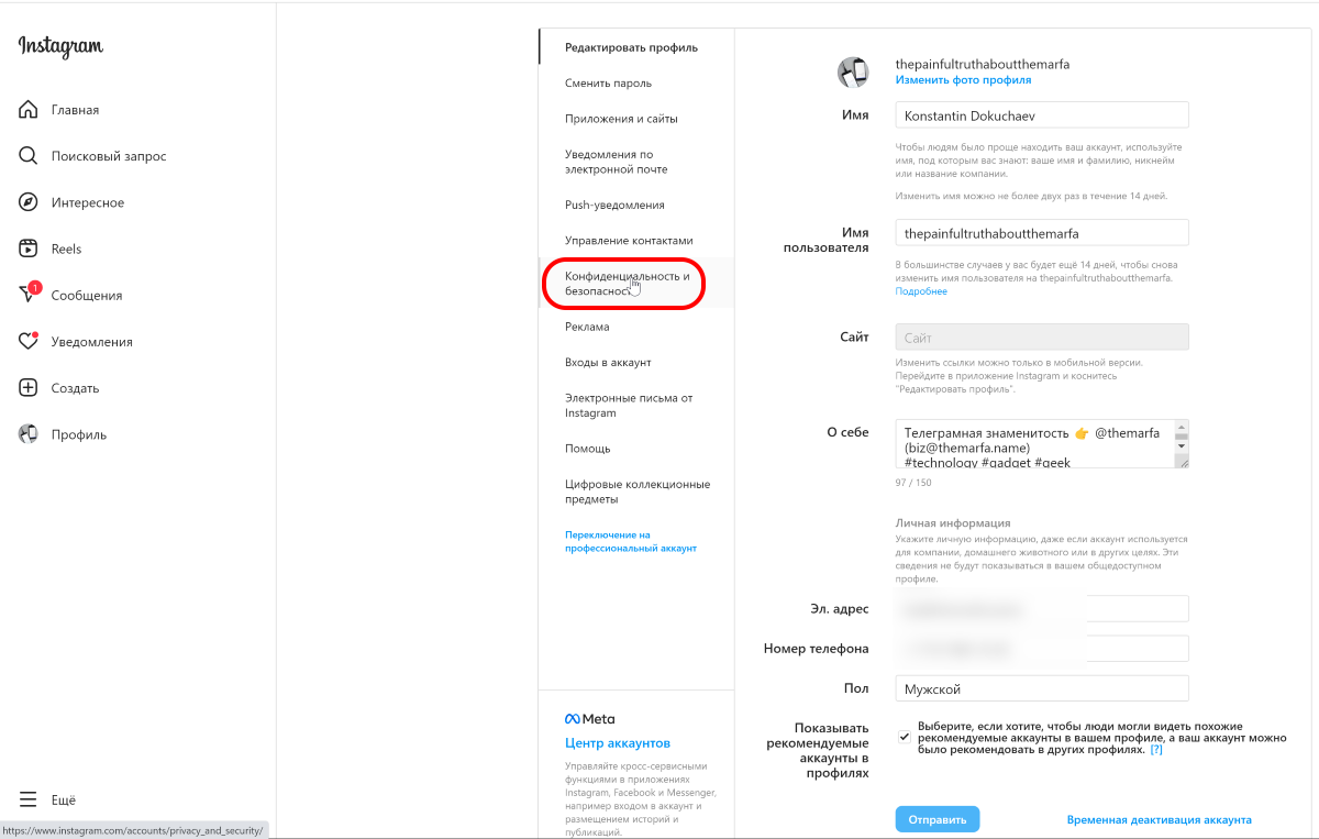 Шаг 2: В Настройках, вы увидите различные параметры настройки вашего аккаунта. Вам нужно запросить данные своего Инста-аккаунта. Для этого нажмите на ссылку «Конфиденциальность и безопасность».