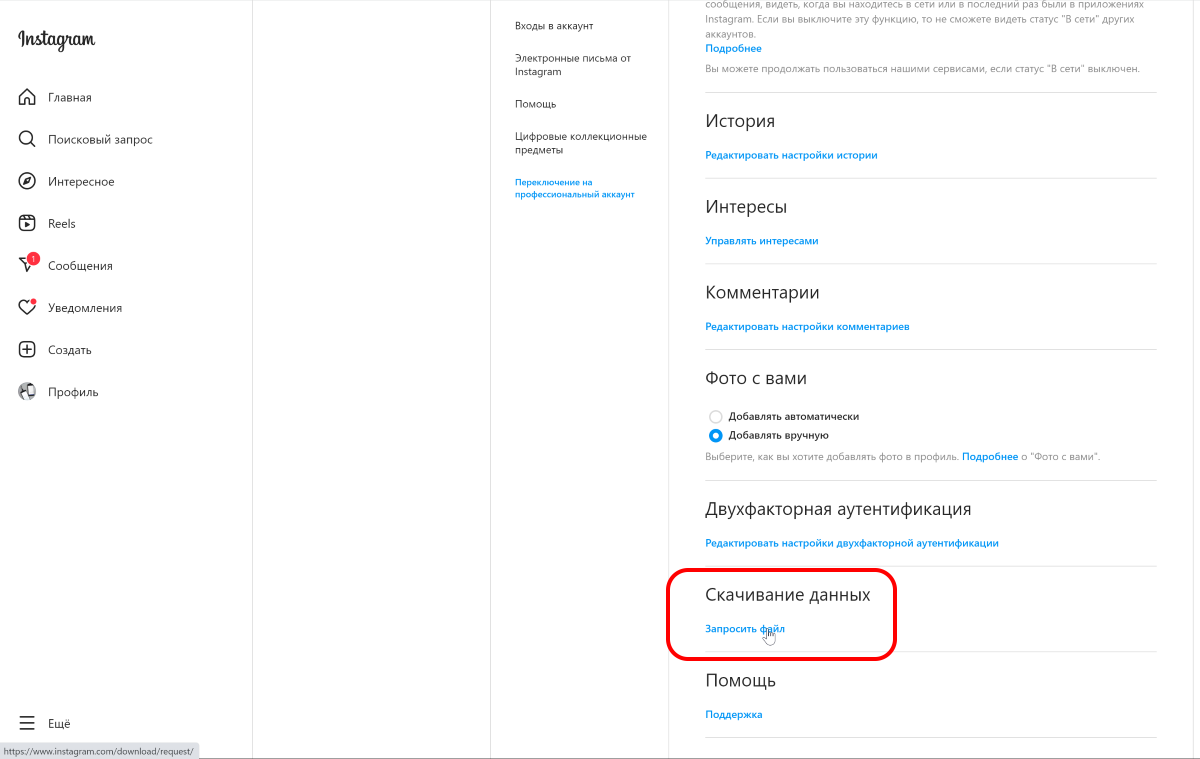 Шаг 3: Теперь нужно выбрать параметр Скачивание данных. Instagram попросит вас ввести пароль вашего аккаунта для подтверждения запроса на скачивание данных.