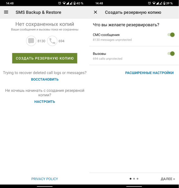 Сразу после запуска SMS Backup & Restore запустится мастер создания резервной копии. Вам будет предложено резервировать только СМС, только Вызовы или всё сразу. Дополнительно можно включить данные из MMS-сообщений.