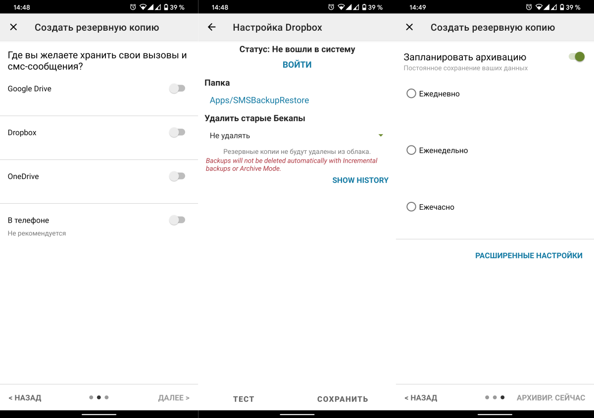 На следующем шаге нужно выбрать место хранения резервных копий. Это может быть Google Drive, Dropbox, OneDrive или память телефона. Бэкап может быть разовым так и запланированным: каждый день, неделю или час.