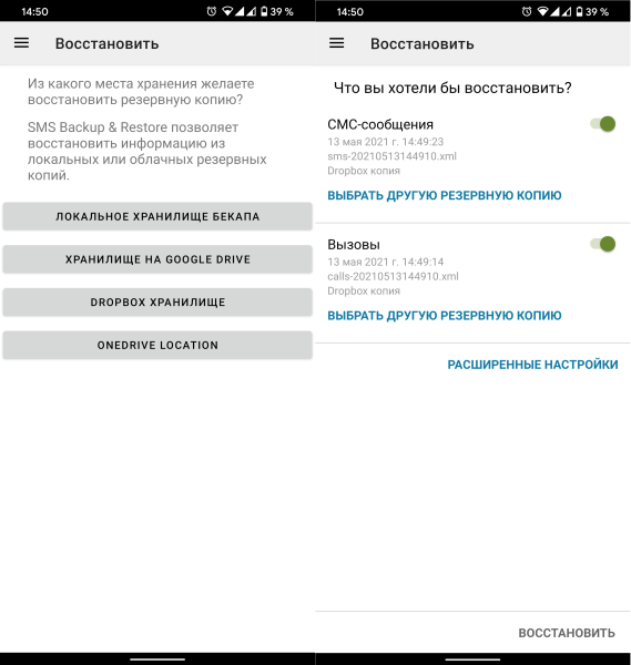 Для восстановления данных от вас потребуется выбрать источник с файлами бэкапа и сами файлы. После нажатия на кнопку Восстановить вся информация появится на смартфоне.