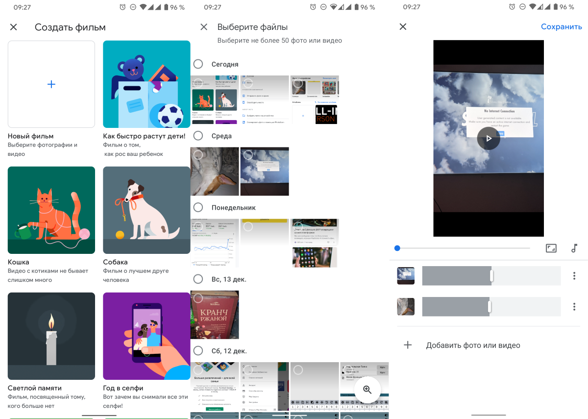 На следующем шаге можно выбрать создание фильма по одному из предустановленных шаблонов Google. В этом случае приложение автоматически подберёт фотографии и создаст видео без вашего участия.