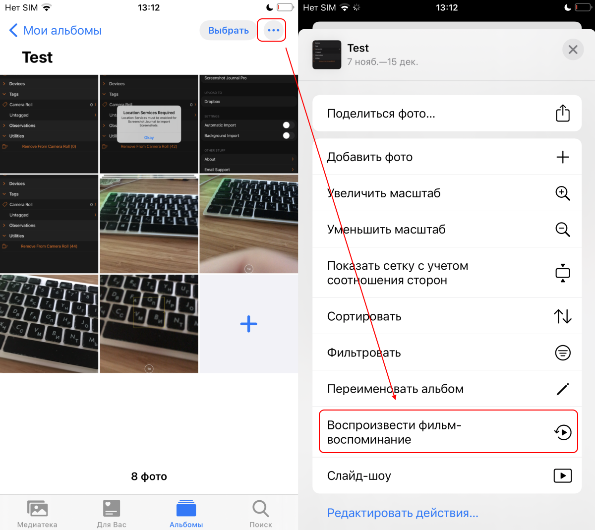 Но создать такое видео можно самому. Откройте приложение Фото и создайте новый альбом с фотографиями, из которых нужно сделать слайд-шоу. Затем в правом верхнем углу нажмите на три точки и в меню шеринга выберите пункт Воспроизвести фильм-воспоминание.