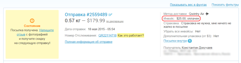 Итого получилось $179,99 + $25, то есть около 11000 рублей по курсу на тот момент.