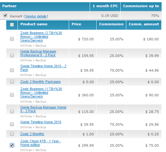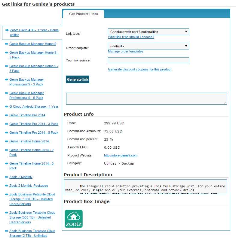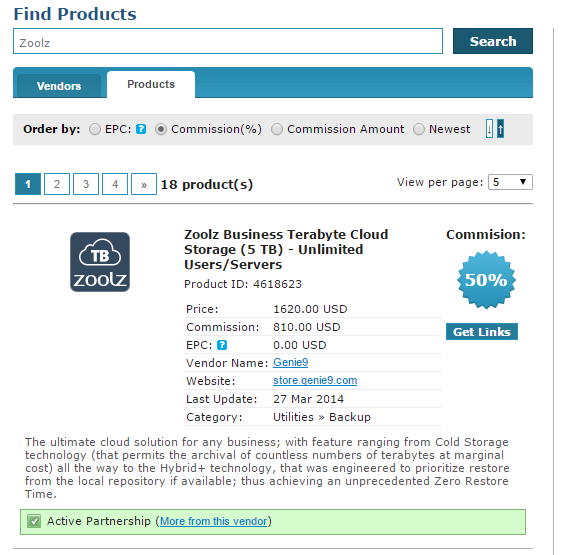 Для этого нужно стать партнёром Zoolz. В контрольной панели, в разделе Find Partners/Products, выбираем вкладку Products, и ищем «Zoolz»: