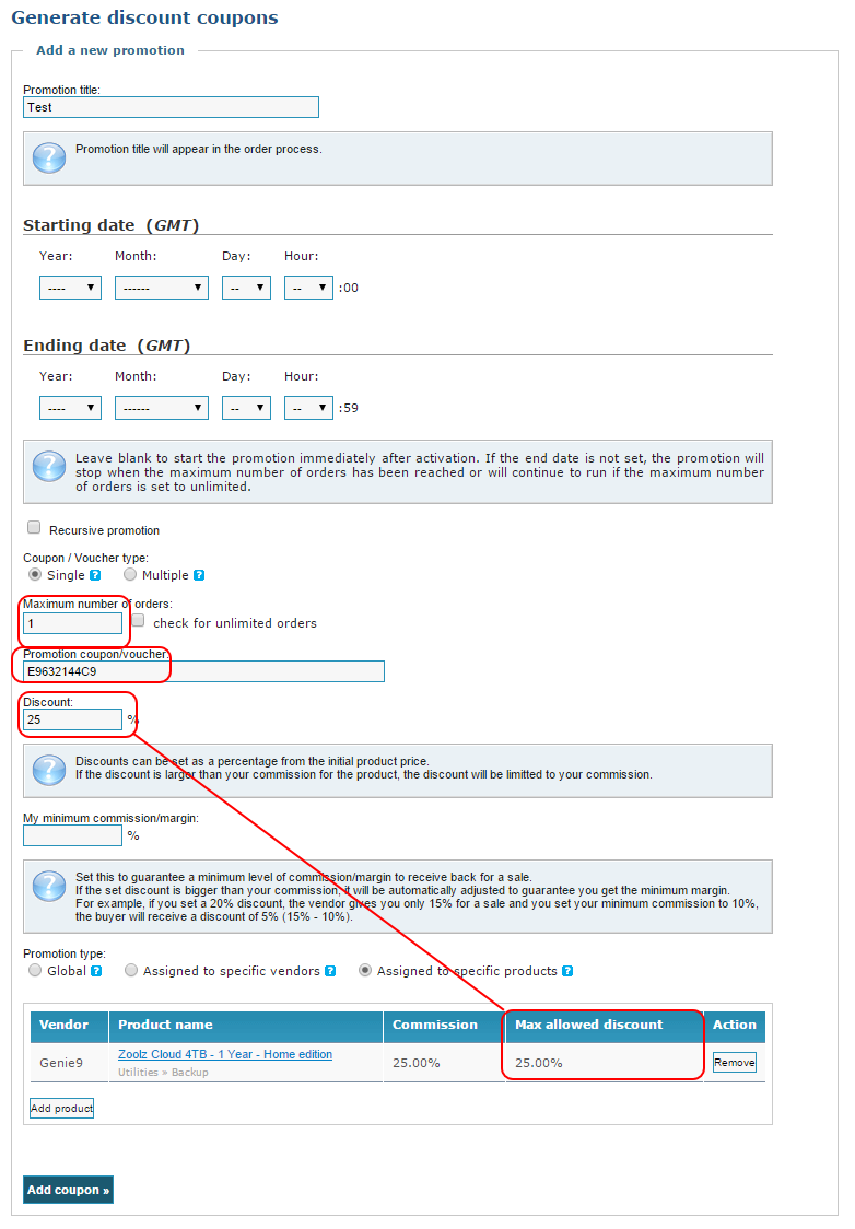 Здесь мы видим генератор купонов на скидку. Все настройки можно оставить по умолчанию, кроме обведённых красным. Maximum number of orders ставим единицу, просто для подстраховки. Promotion coupon/voucher можно оставить как есть или написать всё, что душе угодно (это будет ваш будущий купон). Значение в поле Discount не должно превышать значения, указанного в Max allowed Discount.