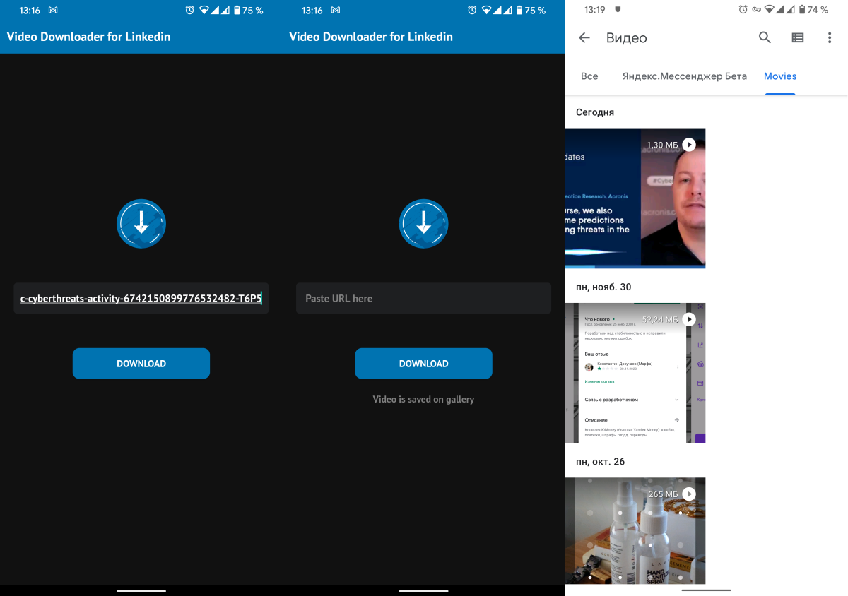 Второе — вставить ссылку в приложение. Третье — нажать кнопку Download. После чего видео окажется в галерее вашего устройства.