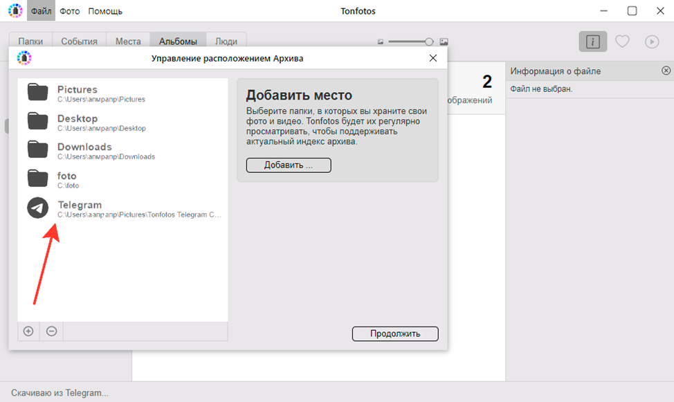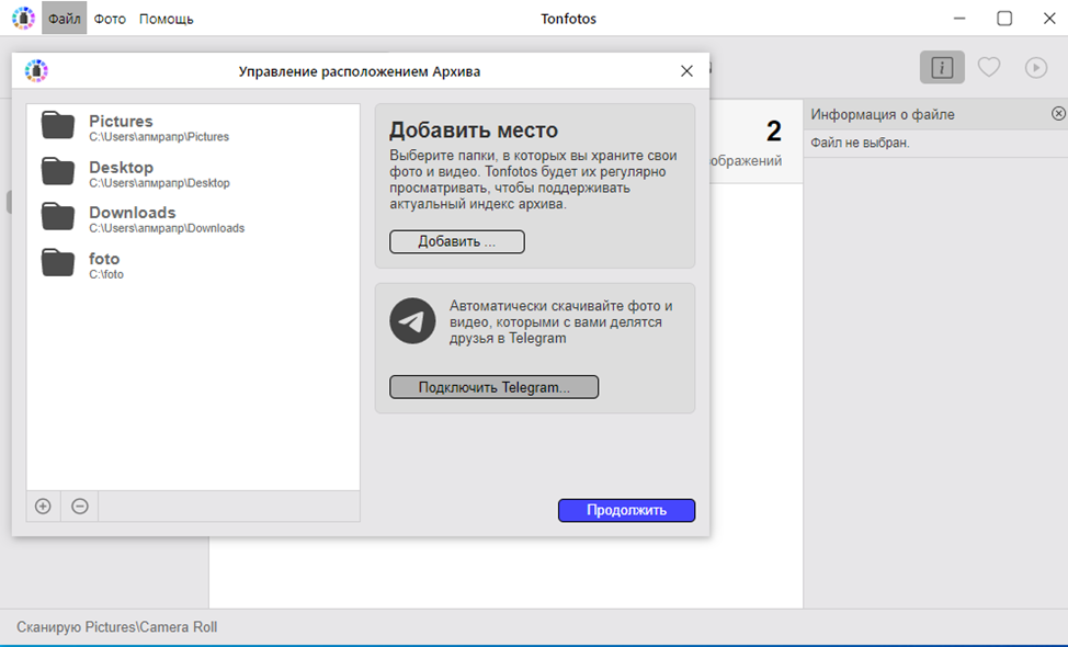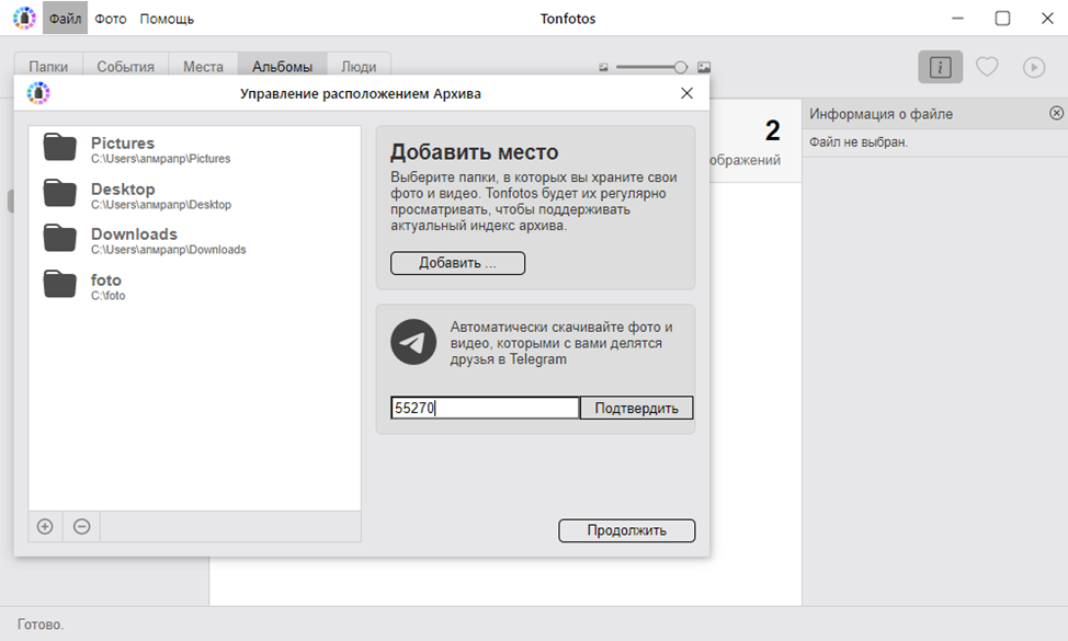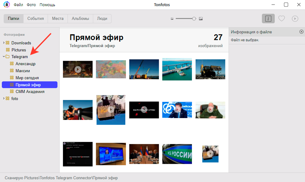 Программа Tonfotos проанализирует чаты, после чего скачает все фото и видео вашего Telegram за последние 30 дней. По результатам будут созданы соответствующие папки. Далее программа в автоматическом режиме будет подключаться к Telegram, отслеживать появления новых фотографий или видео и аккуратно распределять их в соответствии с созданными папками.