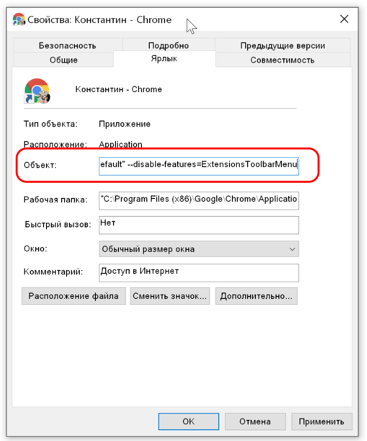 Текст в строке должен выглядеть примерно так "C:\Program Files (x86)\Google\Chrome\Application\chrome.exe" --disable-features=ExtensionsToolbarMenu. Примените изменения и запустите браузер. Иконки больше нет.