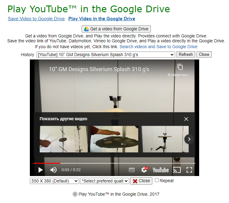 Непонятно зачем, но существуют сервисы, которые позволяют смотреть YouTube ролики прямо из вашего Google Disk. Один из таких сервисов называется Play YouTube™ in the Google Drive.