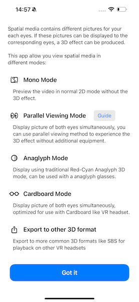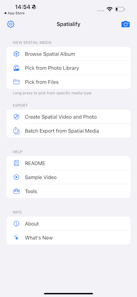 В самом приложении на первый взгляд возможностей не так много. Вы можете просматривать Spatial видео и фото из галереи, перейти к созданию такого видео или поправить уже существующее.