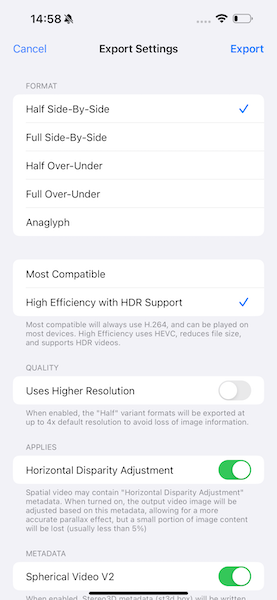 В остальных разделах Spatialify даёт возможность создать видео на основе настроек ваших очков без необходимости редактирования при экспорте. Либо исправить огрехи съёмки.
