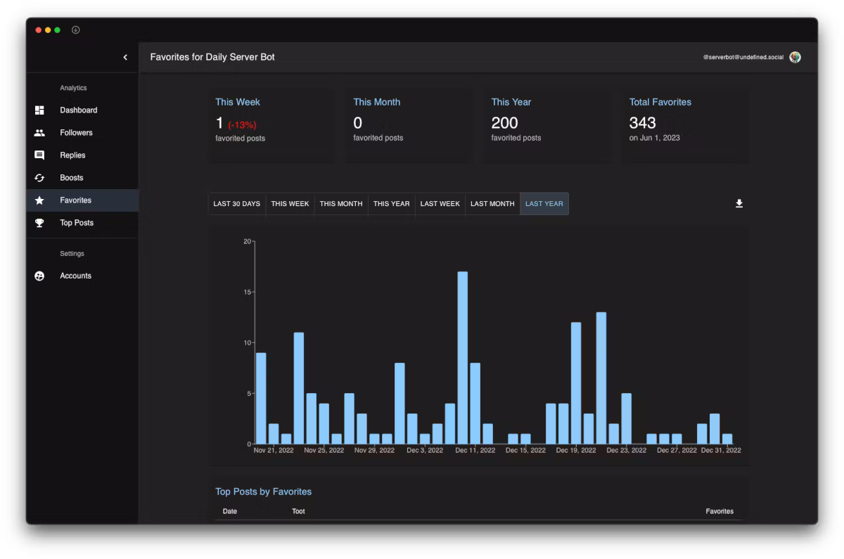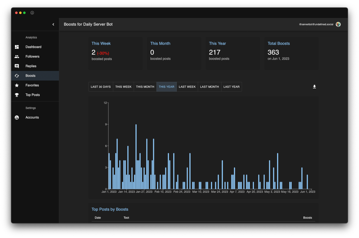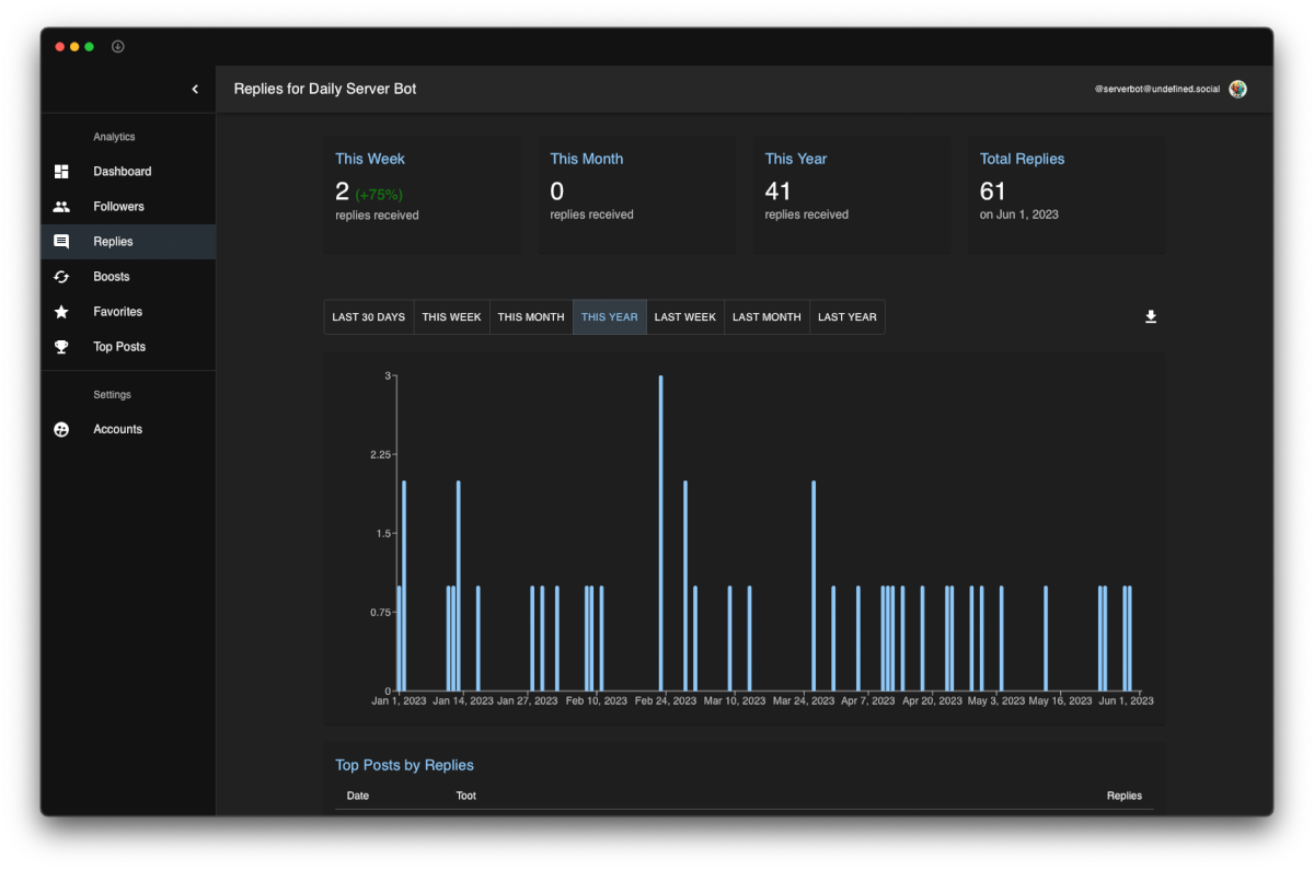 Analytodon поможет отслеживать статистику вашего аккаунта в Mastodon: число подписчиков, взаимодействия, топ постов и прочее.