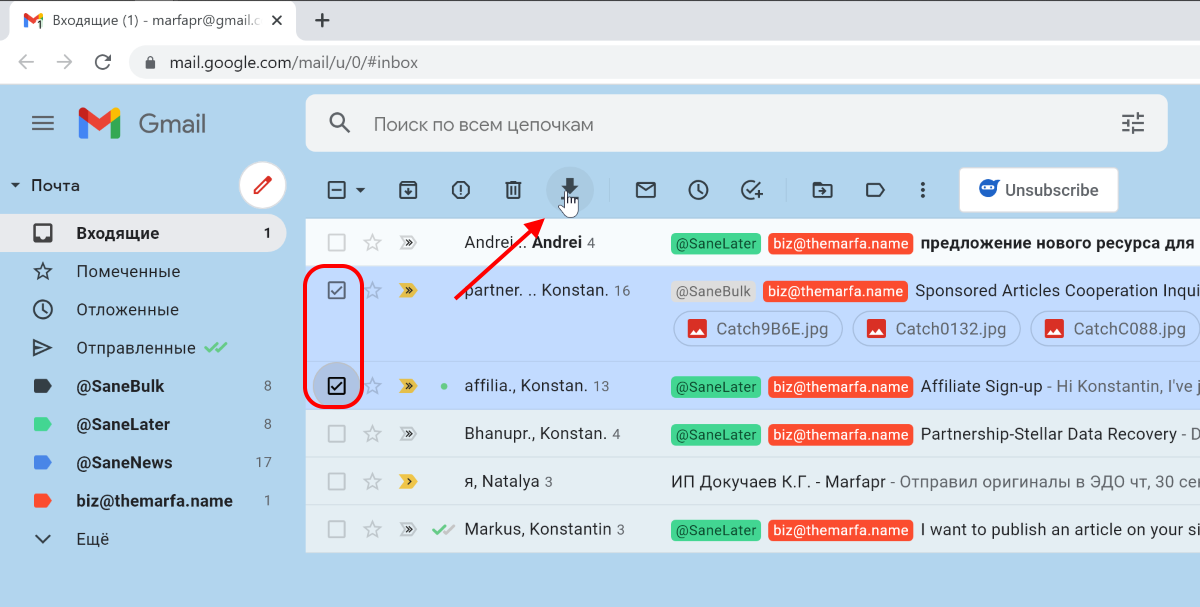 После установки расширения вам нужно перейти в вашу почту Gmail, выбрать нужные письма и нажать кнопку Save Emails.