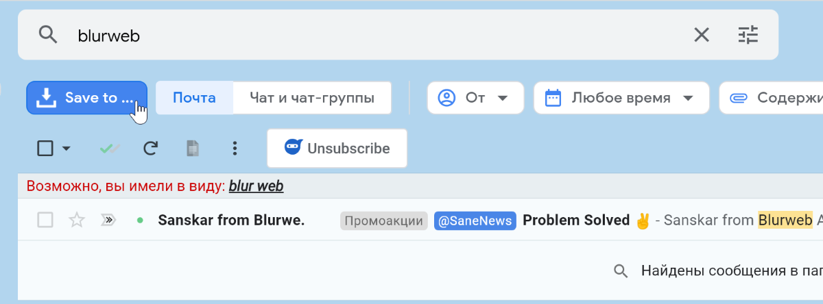 Либо вы можете в поиске указать фильтр, по которым можно найти нужные письма и нажать кнопку Save to.