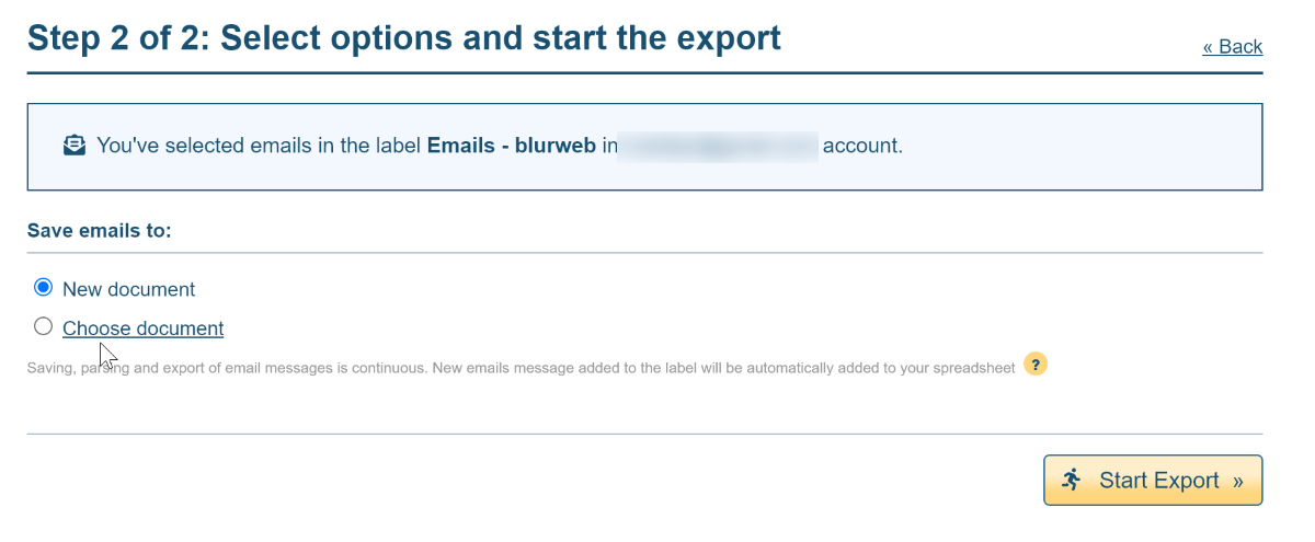 В зависимости от выбранного способа следящий шаг будет немного отличаться. В первом случае вы можете сохранить выбранные письма в существующий документ Google, создать новый или запустить мастер экспорта писем.