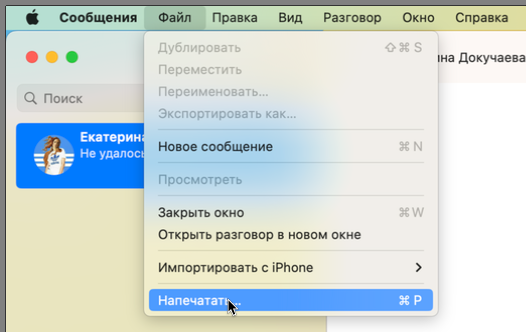 Теперь выберите нужную переписку, и в меню выберите пункт Файл> Напечатать.