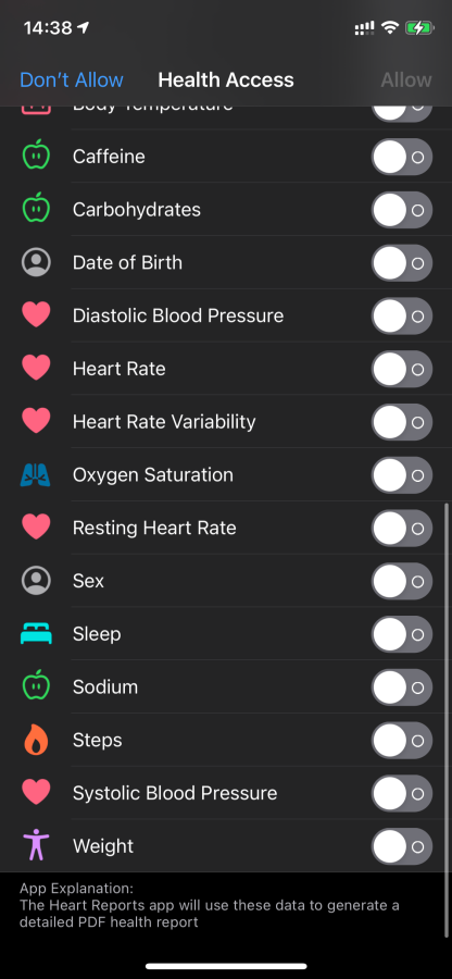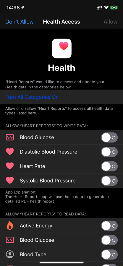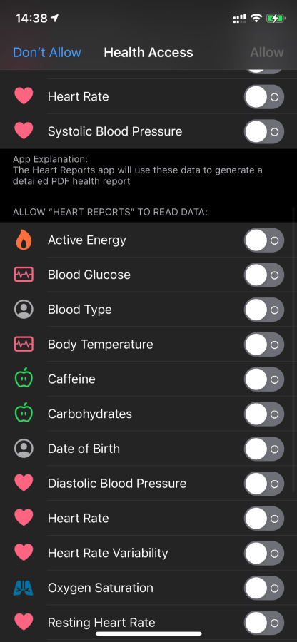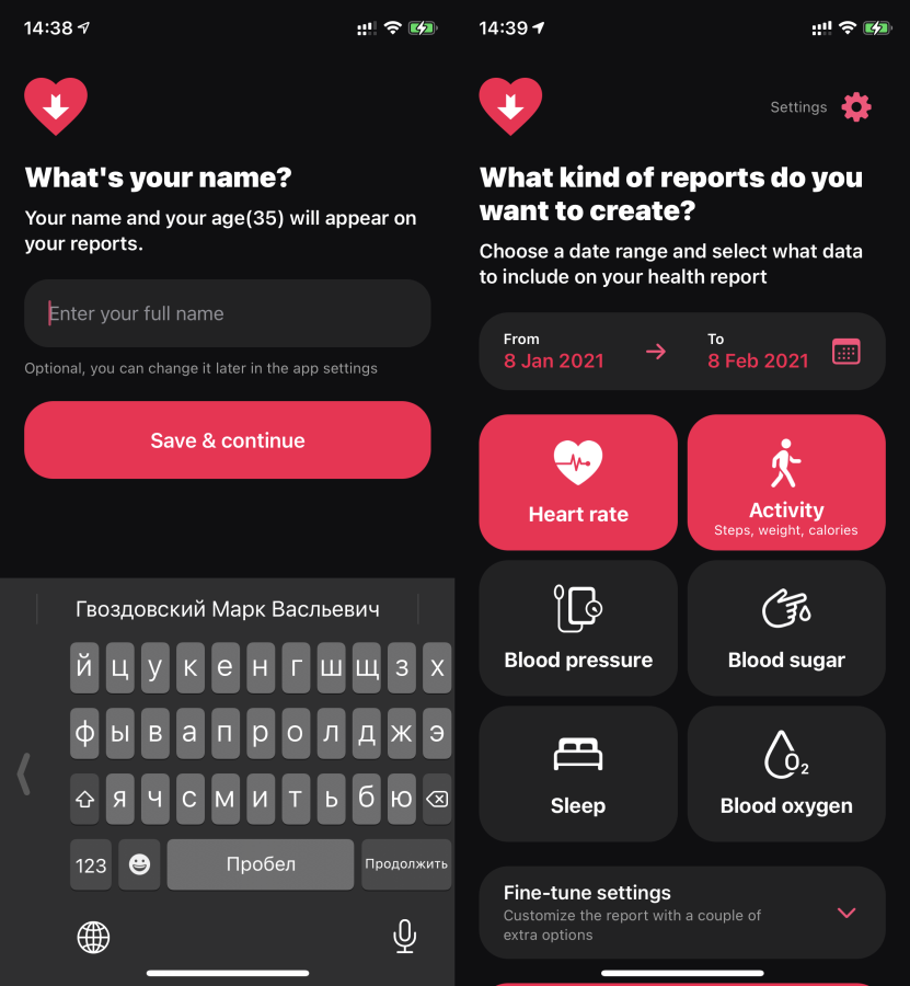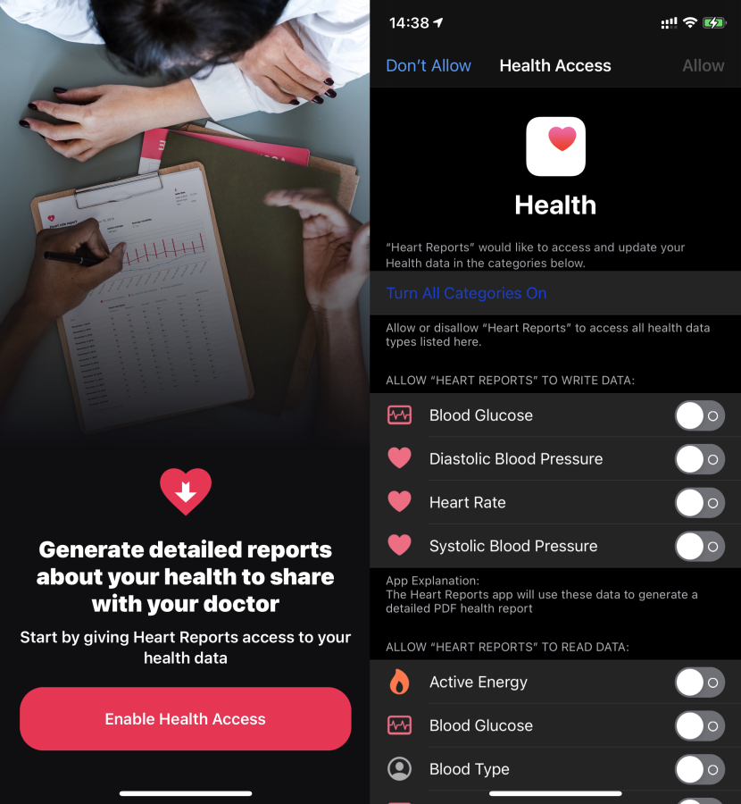 При первом запуске Heart Reports нужно предоставить доступ к данным о здоровье и выбрать какие типы данных нужно собирать.