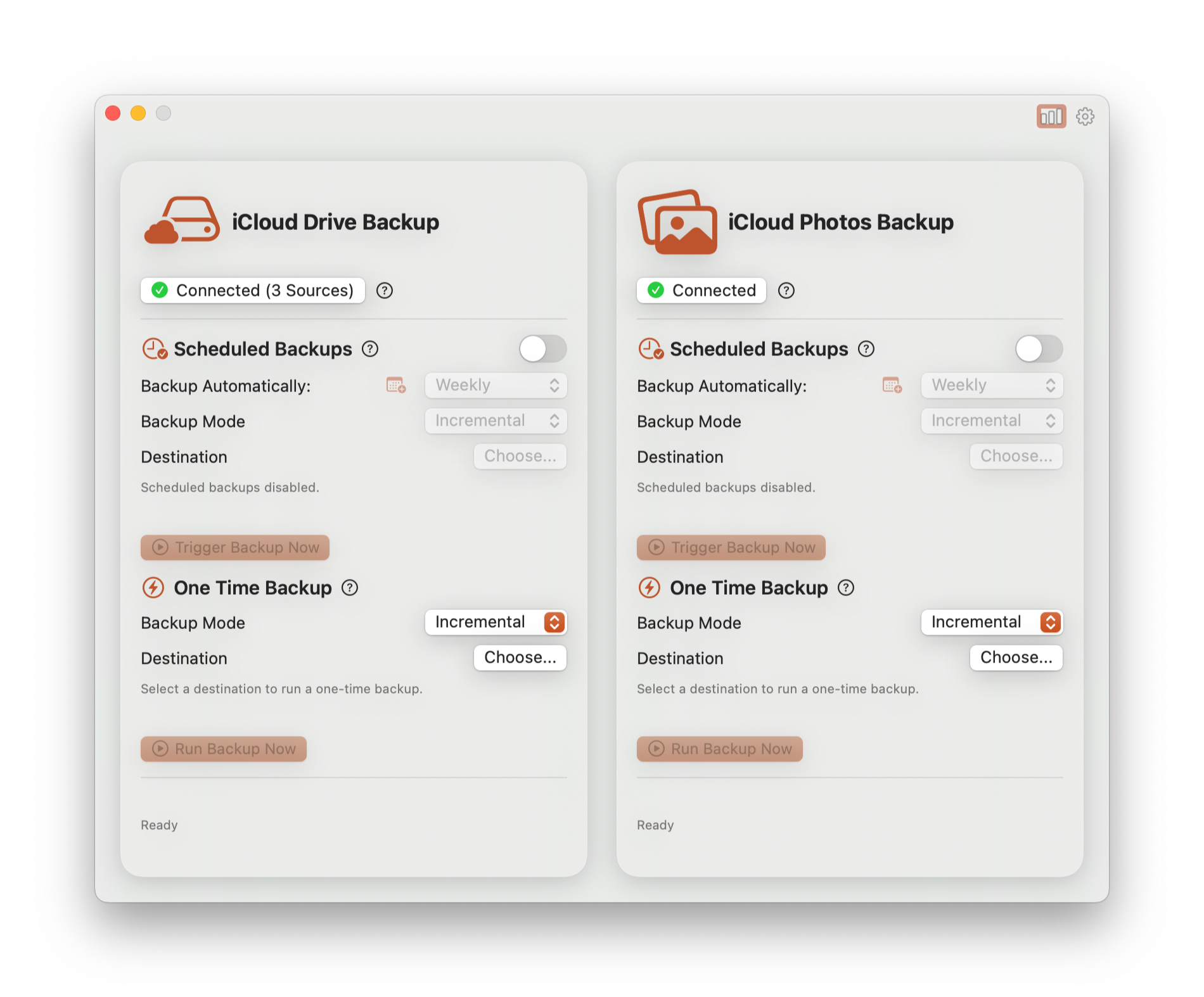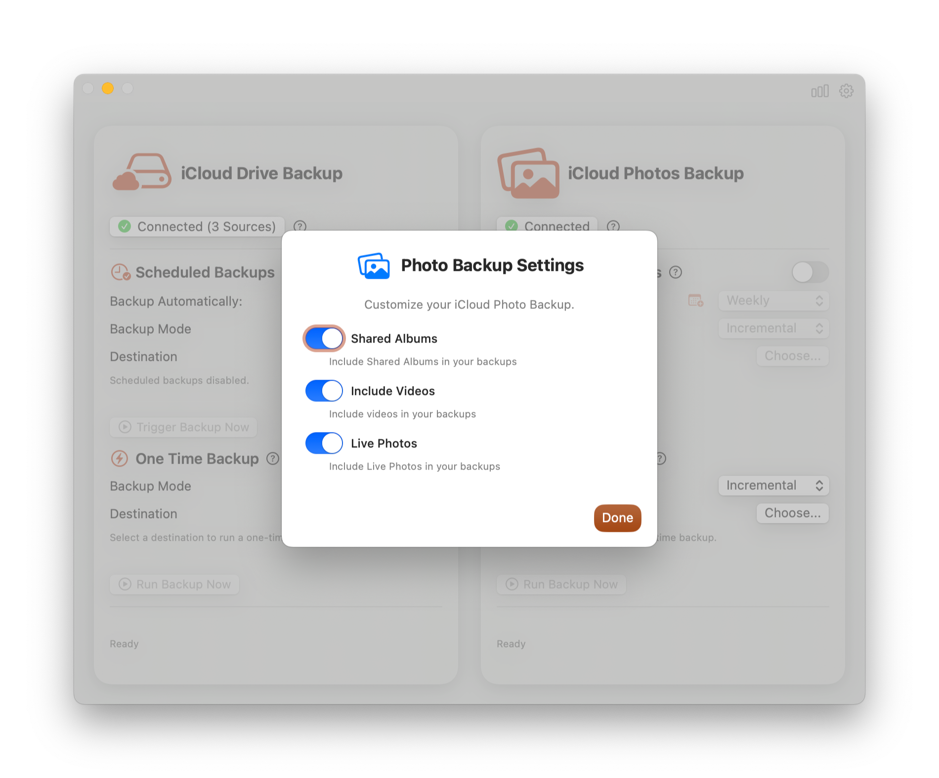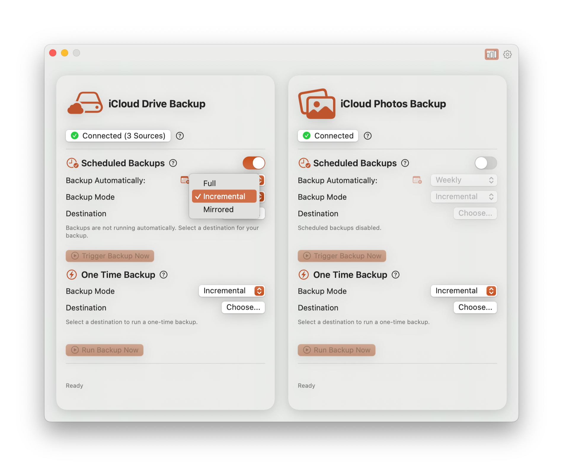По-прежнему можно создать бэкап по требованию или запланировать его. Вы можете выбрать источники бэкапа (фото или файлы) и место хранения резервной копии.