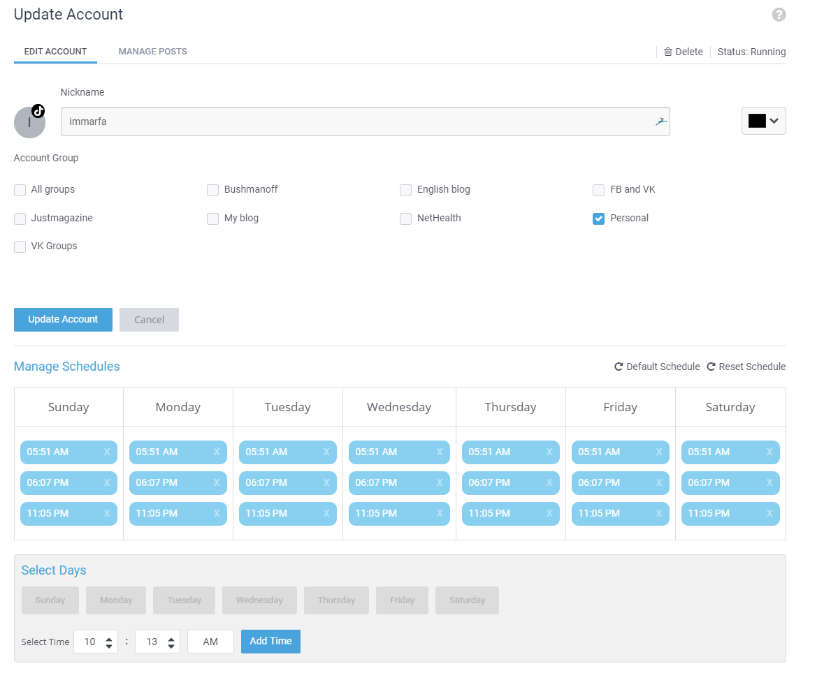 Затем можно настроить параметры автопостинга в SocialPilot. Выбрать группу, если у вас их несколько. Настроить время и дни по умолчанию для постов.