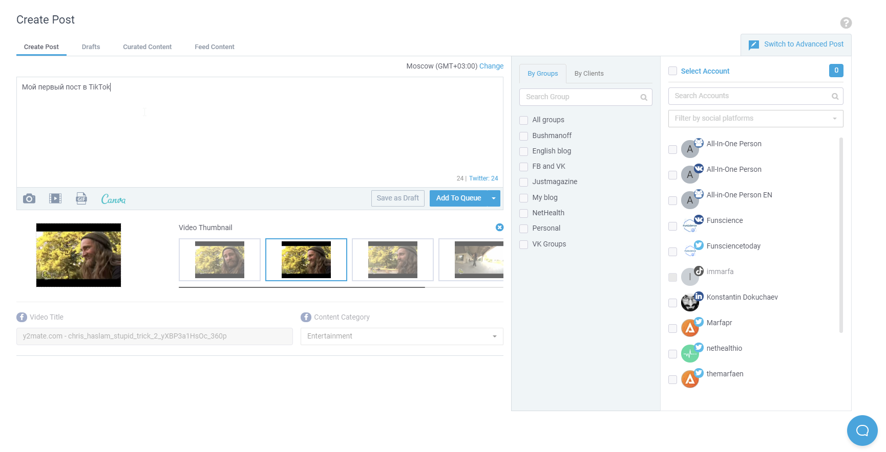 В редакторе постов нужно создать пост, выбрать время публикации и выбрать аккаунт в TikTok.