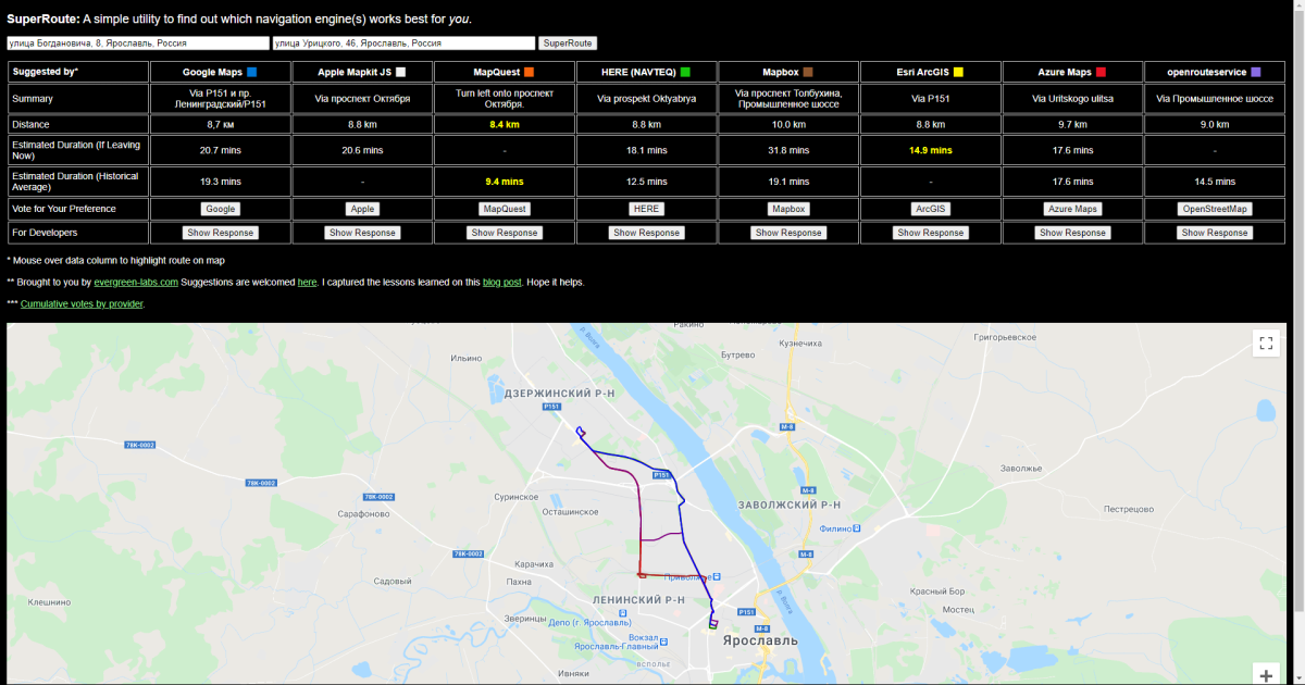 SuperRoute поможет сравнить качество построения маршрута между картами Google, Apple, MapQuest, Mapbox, HERE, Esri, AzureMaps, openrouteservice.