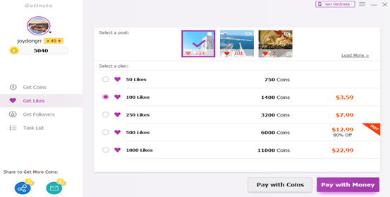 Шаг 2: Зарегистрируйте учётную запись в приложении GetInsta. Войдите в неё. При входе в систему вы сразу получите несколько монет, с помощью которых вы сможете купить подписчиков и лайки.