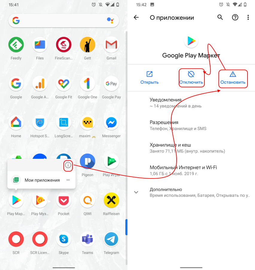 - Завершите приложение Google Play Store. Для этого зажмите иконку приложения, нажмите на значок информации и затем нажмите Остановить и Отключить.