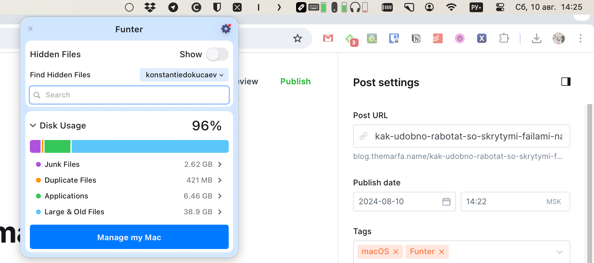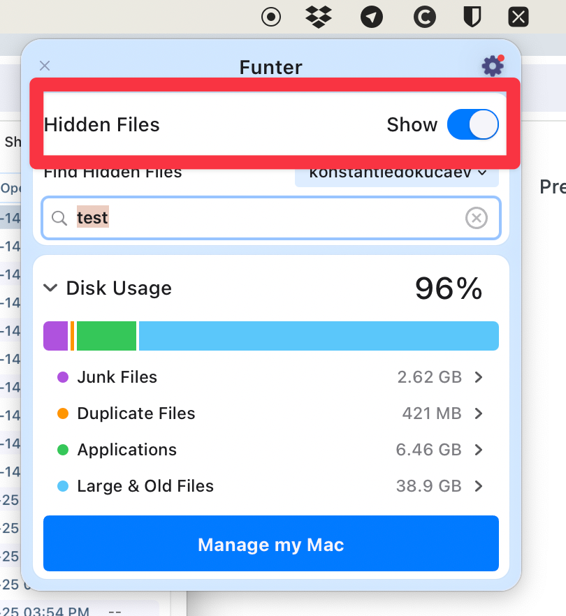 После установки вы сможете получить доступ к Funter из Строки меню. Первое, что сразу заметно — отображение статистики занятости диска.