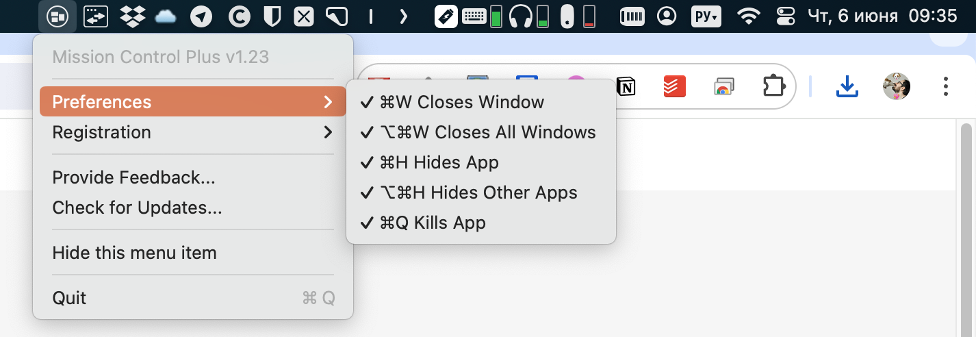 Как видите, у Mission Control Plus нет никаких настроек, кроме возможности отключить лишние хоткеи. Поэтому после её установки можно сразу приступать к работе.