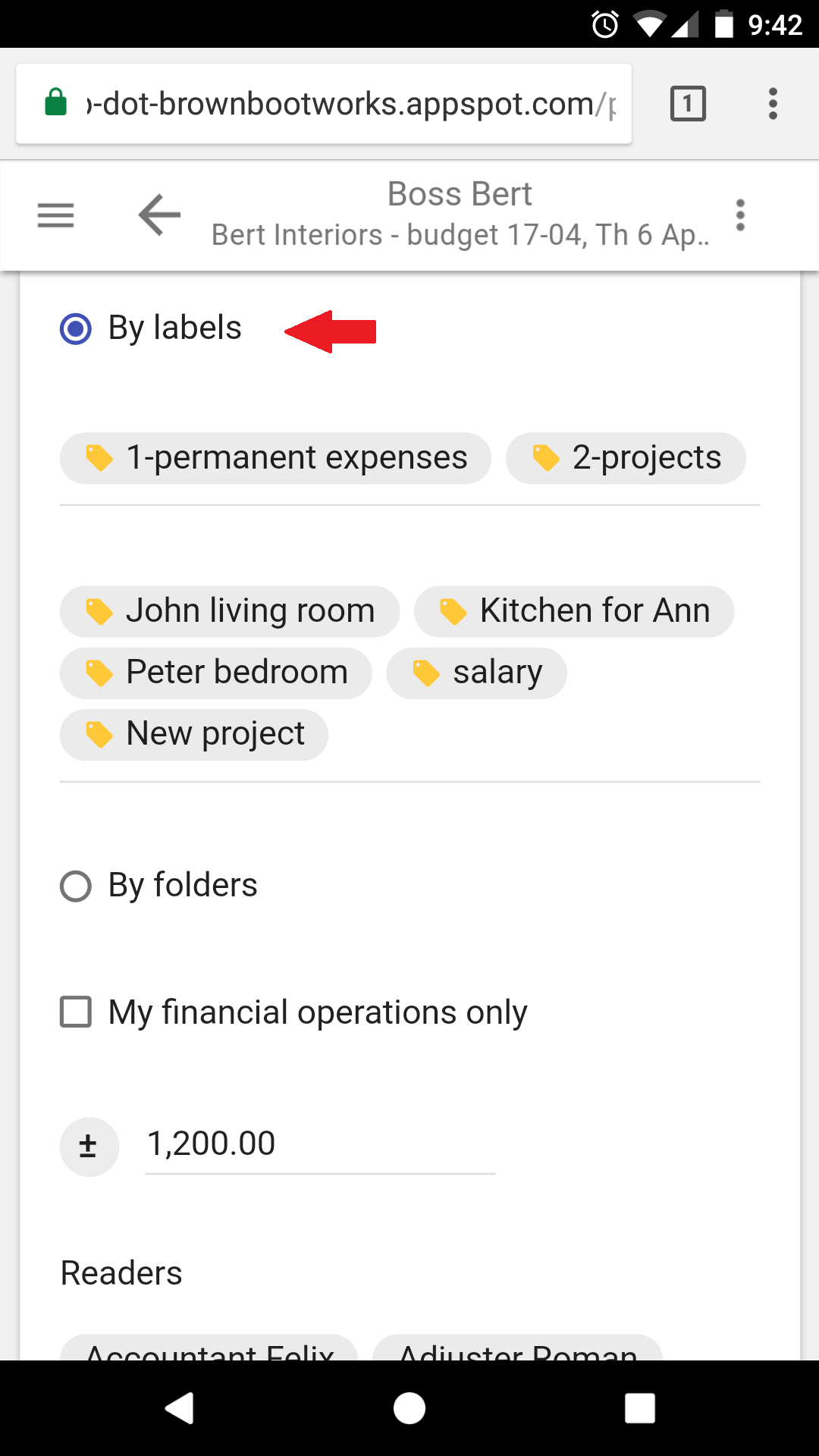 По ярлыкам. Вы можете указать любой набор ярлыков для верхней группировки 1 уровня и для нижней группировки 2 уровня. Будут отобраны только операции из заданий, содержащих указанные ярлыки (или один из ярлыков 1 уровня, или любой набор из ярлыков 1 и 2 уровня). В приведённом выше примере операция доставки общая для всех проектов, поэтому задание с этой операцией имеет только ярлык 1 уровня «projects». Задание с заказом конкретного клиента имеет два ярлыка «projects» и, например, «Kitchen for Ann».