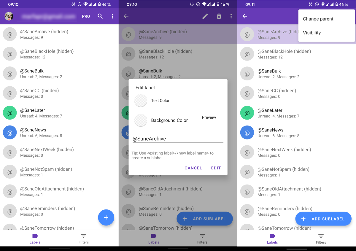При нажатии на кнопку «+» и Add Sublabel можно создать новый ярлык или вложенный ярлык.