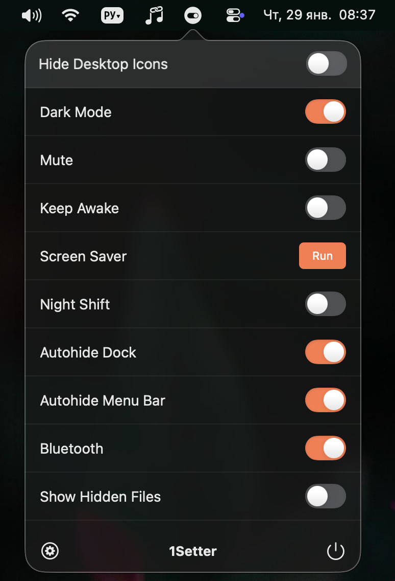 Упростить управление такими параметрами можно с помощью приложения 1Setter, которое даёт доступ к ним прямо из Строки меню.