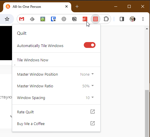 При переносе вкладки браузера в отдельное окно, она автоматически будет выставлена рядом с предыдущим окном. Но можно нажать кнопку Tile Windows Now для принудительной расстановки.