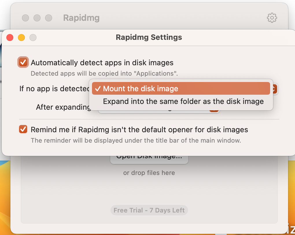 Решить эту проблему можно с помощью утилиты Rapidmg, которая всё сделает за вас. После её установки от вас потребуется только выдать права на доступ к Приложениям, а затем в настройках указать поведение при открытии .dmg.