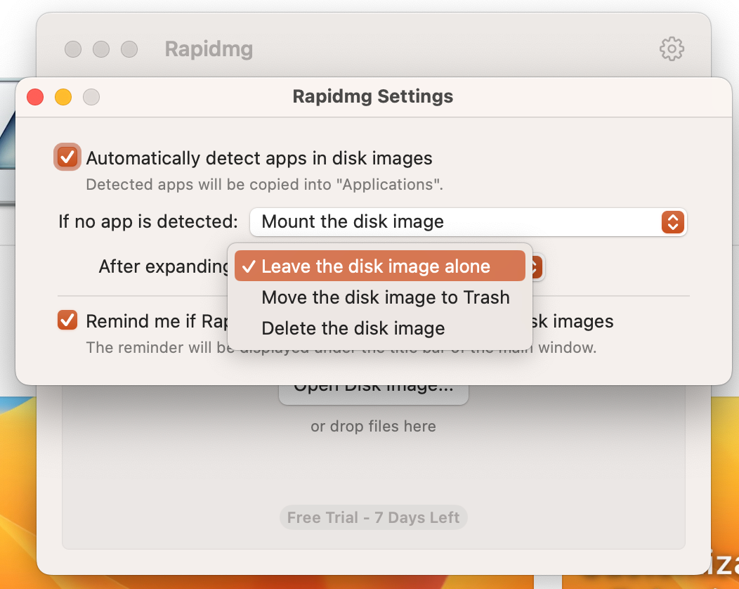 Здесь можно настроить автоудаление в корзину, полное удаление или ничего не делать. Также можно указать Rapidmg приложением по умолчанию для таких файлов.