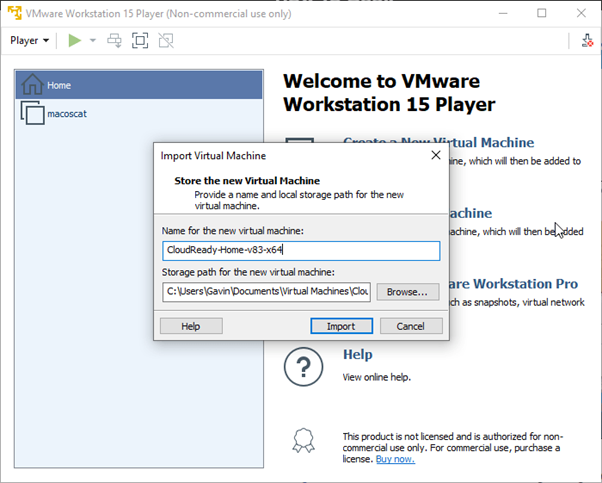 Для этого запустите VMware Workstation Player, пройдите по шагам: «Player» >> «File» >> «Open». После чего найдите образ Chrome OS. В открывшемся окошке «Import Virtual Machine» выберите опции по умолчанию, затем нажмите кнопку «Import».