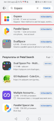 Шаг 1. Открываем AppGallery – в строке поиска вводим Gspace – нажимаем «Установить».