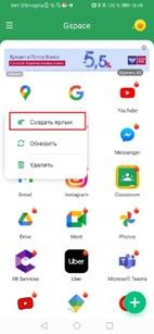 Все установленные программы будут доступны для запуска в меню Gspace. Также здесь можно создать ярлык на рабочий стол. Для этого зажмите иконку нужного приложения и вам будет предложено создать ярлык.