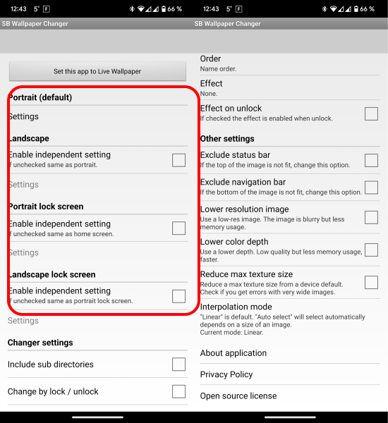 В случае с Android-смартфонами это возможно благодаря приложению SB Wallpaper Changer. Сразу при его запуске вы попадёте в настройки, где нам важны пункты Portrait, Landscape, Portrait lock screen и Landscape lock screen.