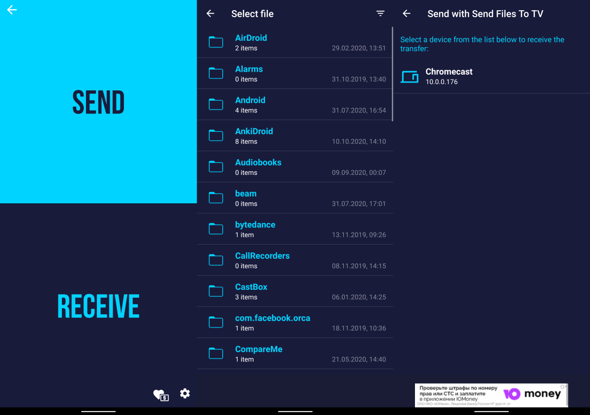 Теперь на смартфоне проделайте то же самое, но вместо Receive выберите Send. В открывшемся окне выберите APK-файл, выберите телевизор, и сразу при нажатии на него он отправится по месту назначения.