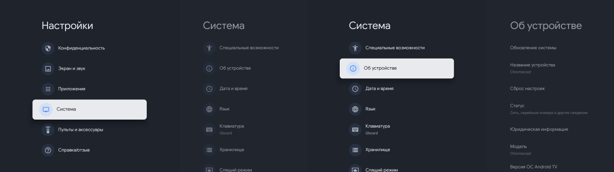 На телевизоре откройте меню Настройки > Система > Об устройстве.