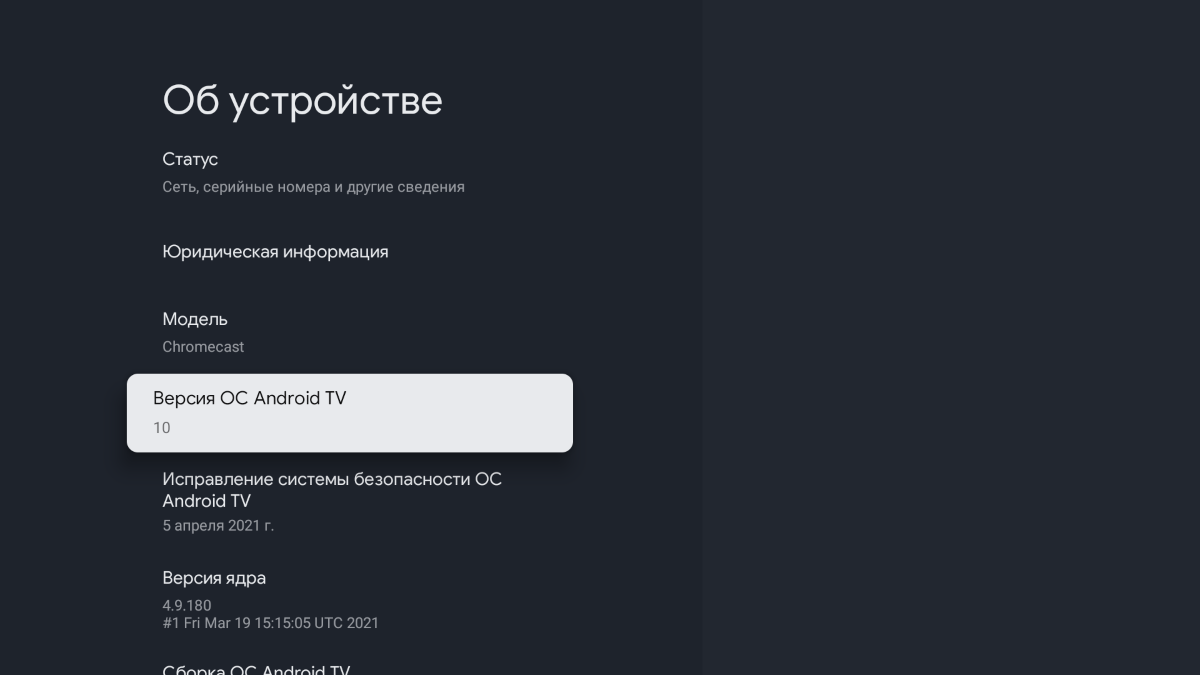 Прокрутите меню вниз и нажмите несколько раз на пункт Версия ОС Android TV, пока не появится сообщение о разблокировке настроек разработчика.