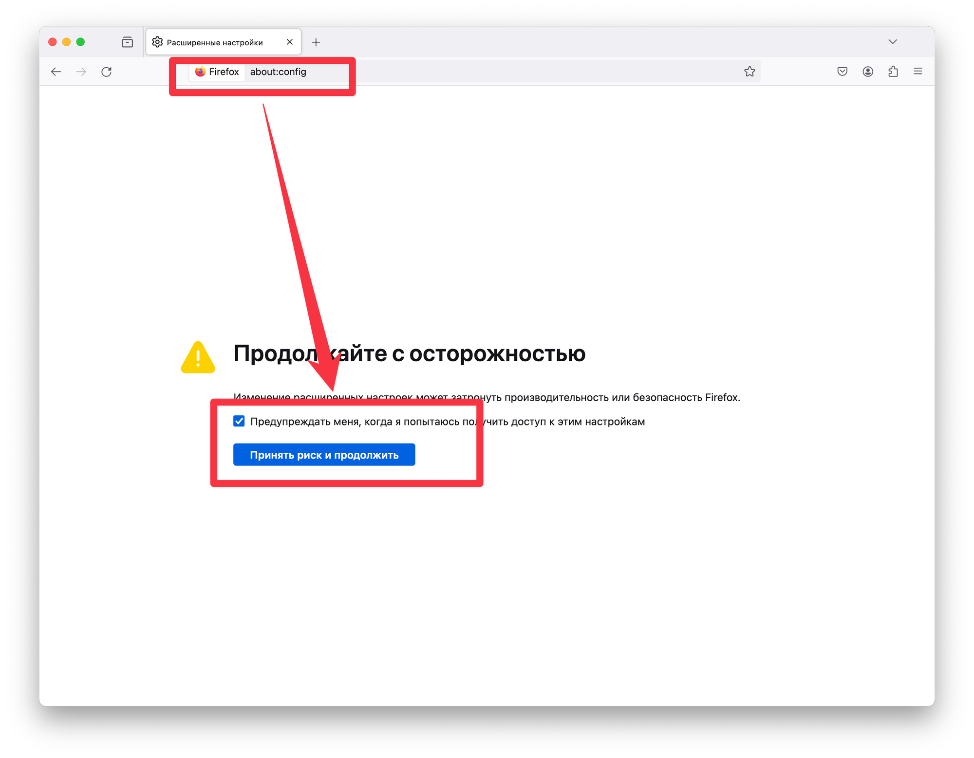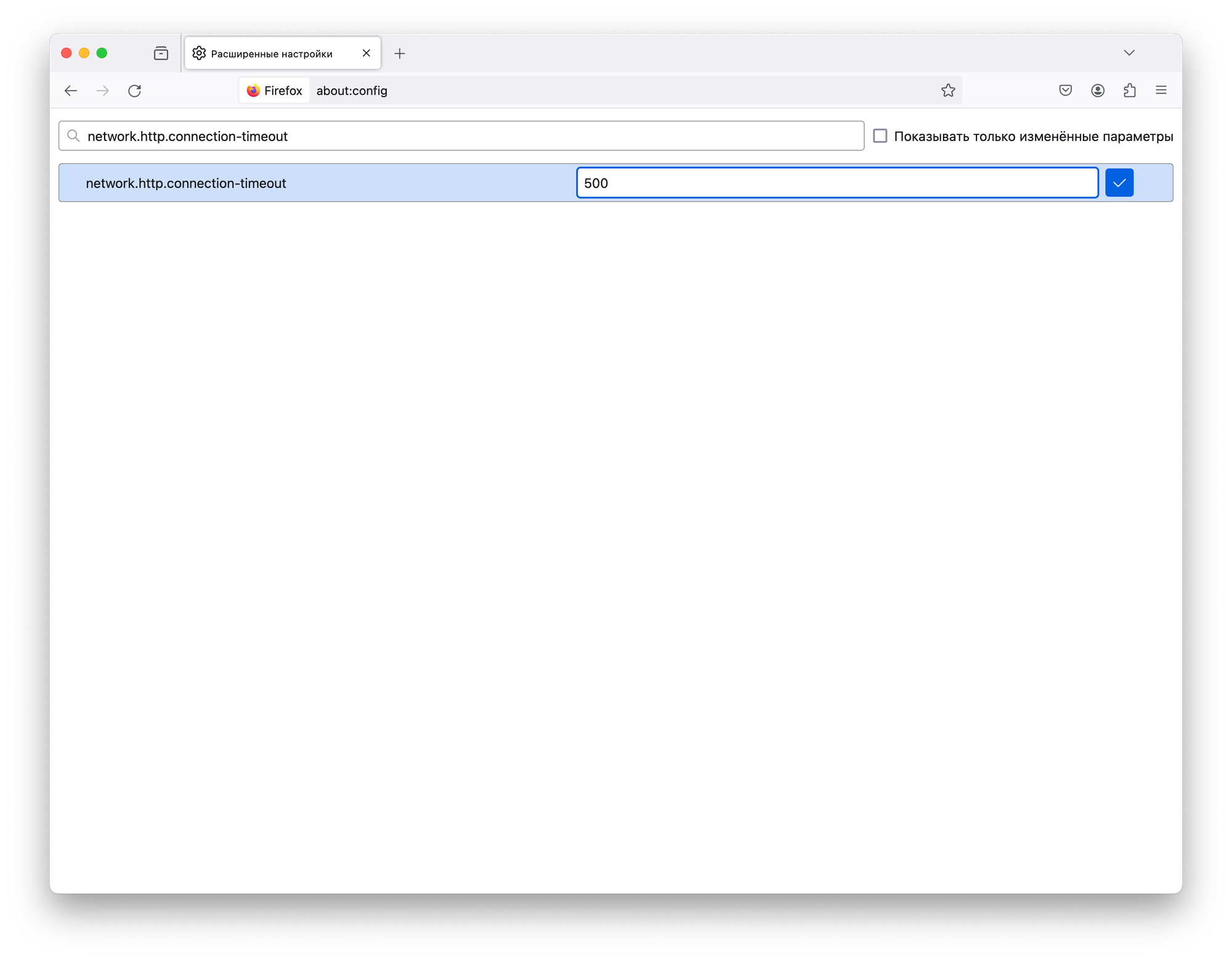 Попробовать решить эту проблему можно с помощью повышения времени до таймаута в настройках Firefox. Для этого в адресной строке перейдите на страницу about:config и согласитесь на внесение изменений.