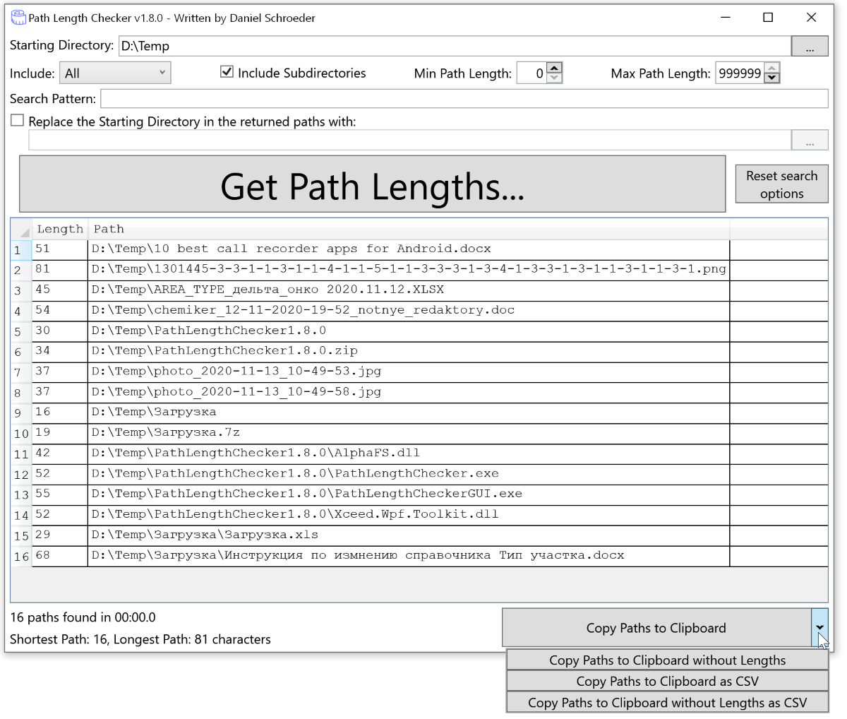 Результаты поиска отображаются в Path Length Checker, а внизу указано общее число путей, самое короткое и самое длинное значение. Результат можно скопировать в буфер обмена или экспортировать в CSV.