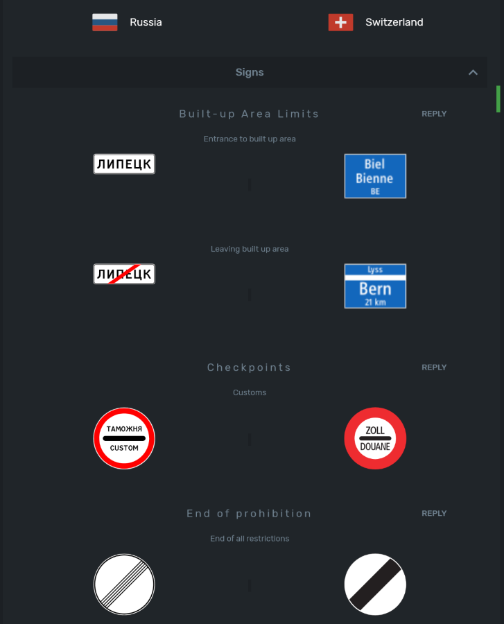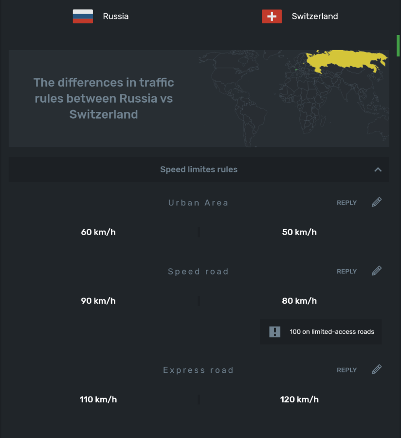 После чего откроется табличка с подробным сравнением ПДД между выбранными странами.