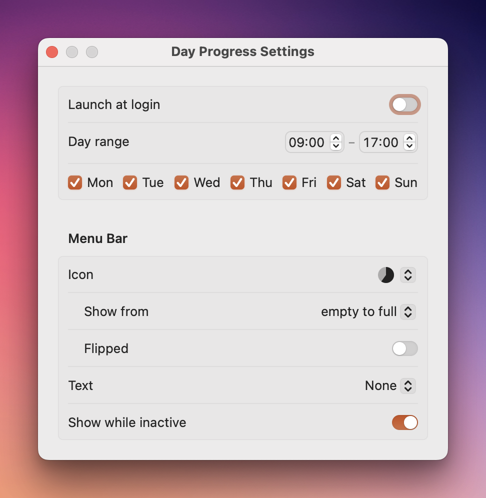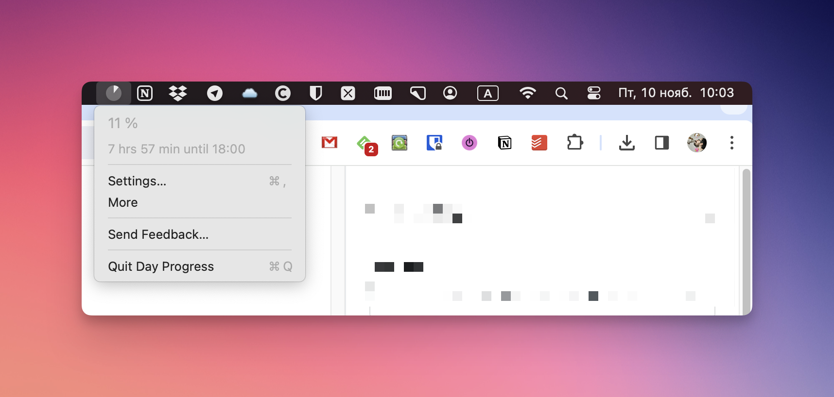 В таком случае именно для тебя создано приложение Day Progress, которое прямо в Строке меню отображает информацию об этом в процентах и часах.