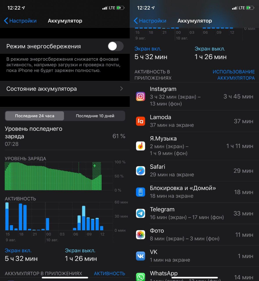 На iOS перейдите в Настройки, а затем нажмите на пункт Аккумулятор. Отобразится список приложений с данными о расходе аккумулятора за сутки и неделю.